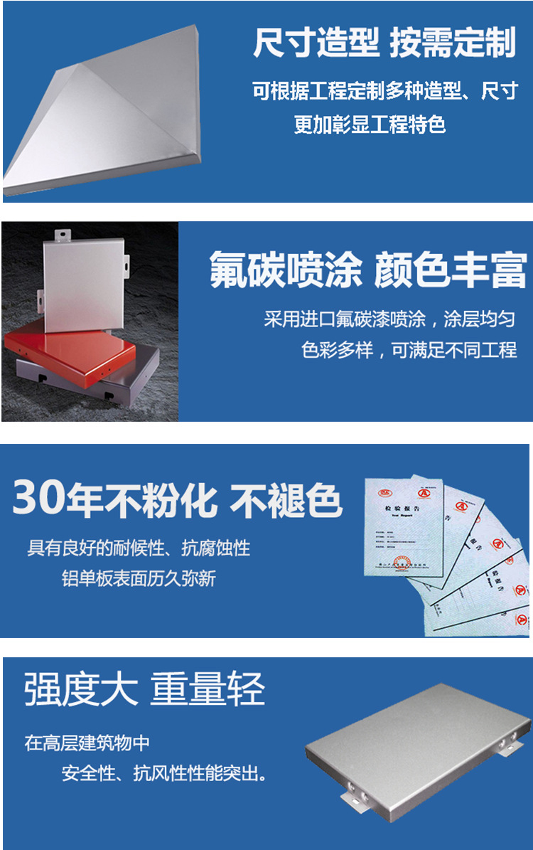 鋁單板采用優(yōu)質(zhì)鋁板加工而成,表層采用氟碳噴涂,不受紫外線、溫度、氣溫和大氣侵蝕,更具有良好的抗彎曲度及優(yōu)良的抗風(fēng)壓性能,并且能夠發(fā)揮其特點, 二次開發(fā)使用。鋁單板可加工成各種弧