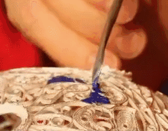燒藍(lán) 是將整個(gè)胎體填滿(mǎn)色釉后,再拿到爐溫大約800℃的高爐中烘燒,色釉由砂粒狀固體熔化為液體,待冷卻后成為固著在胎體上的絢麗的色釉,此時(shí)色釉低于銅絲高度,所以得再填一次色釉,再經(jīng)燒結(jié),一般要連續(xù)四五次,直至將紋樣內(nèi)填到與掐絲紋相平。