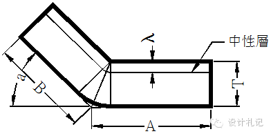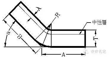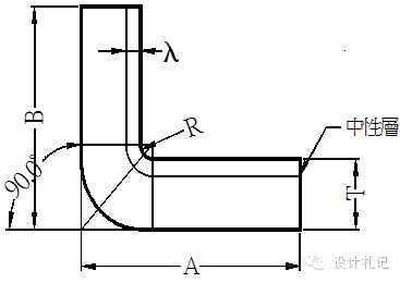 | 4.3 R≠0 θ=90° L=(A-T-R)+(B-T-R)+(R+λ)*π/2 當R ≧5T時 λ=T/2 1T≦ R <5T λ=T/3 0 < R <T λ=T/4 (實際展開時除使用尺寸計算方法外,也可在確定中性層位置后,通過偏移再實際測量長度的方法.以下相同) |