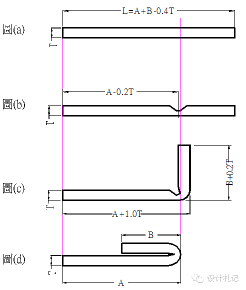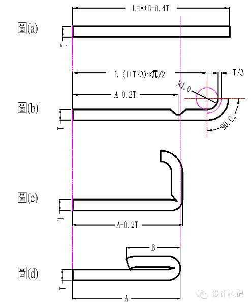 | 4.12卷圓壓平 圖(a): 展開長度 L=A+B-0.4T 圖(b): 壓線位置尺寸 A-0.2T 圖(c): 90°折彎處尺寸為A+0.2T 圖(d): 卷圓壓平后的產(chǎn)品形狀 |