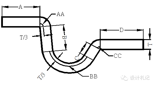 | 4.14 綜合計算如圖: L=料內(nèi)+料內(nèi)+補償量 =A+B+C+D +中性層弧長(AA+BB+CC) (中性層弧長均按 “中性層到板料內(nèi)側(cè)距離λ=T/3”來計算) |