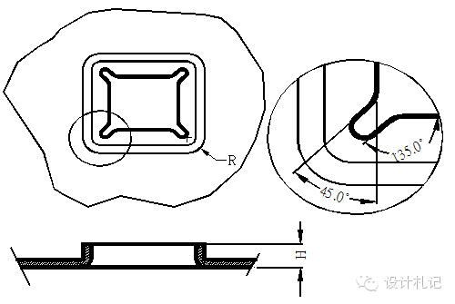 | 4.9 方形抽孔 方形抽孔,當抽孔高度較高時(H>Hmax),直邊部展開與彎曲一致, 圓角處展開按保留抽高為H=Hmax的大小套彎曲公式展開,連接處用45度線及圓角均勻過渡, 當抽孔高度不高時(H≦Hmax)直邊部展開與彎曲一致,圓角處展開保留與直邊一樣的偏移值. 以下Hmax取值原則供參考. 當R≧4MM時: 材料厚度T=1.2~1.4取Hmax =4T 材料厚度T=0.8~1.0取Hmax =5T 材料厚度T=0.7~0.8取Hmax =6T 材料厚度T≦0.6取Hmax =8T 當R<4MM時,請示上級. |