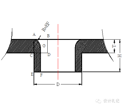 | 4.8 抽芽 抽芽孔尺寸計算原理為體積不變原理,即抽孔前后材料體積不變;ABCD四邊形面積=GFEA所圍成的面積. 一般抽孔高度不深取H=3P(P為螺紋距離),R=EF見圖 ∵ T*AB=(H -EF)*EF+π*(EF)2/4 ∴ AB={H*EF+(π/4-1)*EF2}/T ∴預(yù)沖孔孔徑=D – 2AB T≧0.8時,取EF=60%T. 在料厚T<0.8時,EF的取值請示上級. |