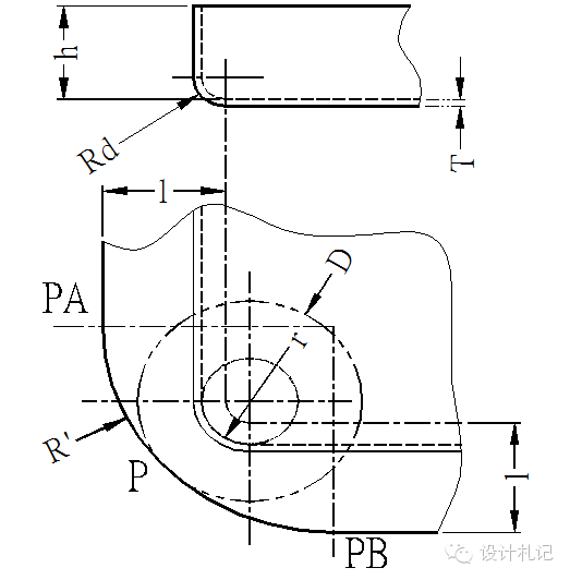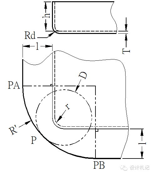 | 4.11壓縮抽形2 (Rd>1.5T) 原則:直邊部分按彎曲展開,圓角部分按拉伸展開,然后用三點切圓(PA-P-PB)的方式作一段與兩直邊和直徑為D的圓相切的圓弧. 當Rd>1.5T時: l按相應(yīng)折彎公式計算. D/2={(r+T/3)2 +2(r+T/3)*(h+T/3) -0.86*(Rd-2T/3)*[(r+T/3) +0.16*(Rd-2T/3)]}1/2 |